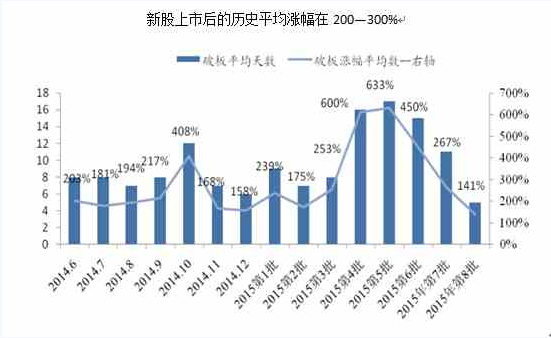 国泰君安称,根据历史经验来看新股上市后涨幅落在200-300%是大概率区间,但由于本批新股是重启后第一批,并且家数少,预期会受到市场热捧,考虑到2015 年4-5月发行的新股上市后平均涨幅超过600%,并且在8 月以来的反弹旱情中次新股作为领涨股,吸引了大量市场人气,我们预期上市后涨幅可能会超过350%的测算涨幅,乐观估计平均涨幅或将达到400%以上。