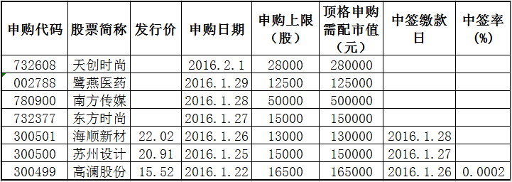 中国证券网讯 1月26日(周二),海顺新材(300501)将通过深交所网上交易系统进行申购;而高澜股份(300499)中签的投资者在1月26日(周二)应确保其资金账户有足额的新股认购资金,不足部分视为放弃认购。