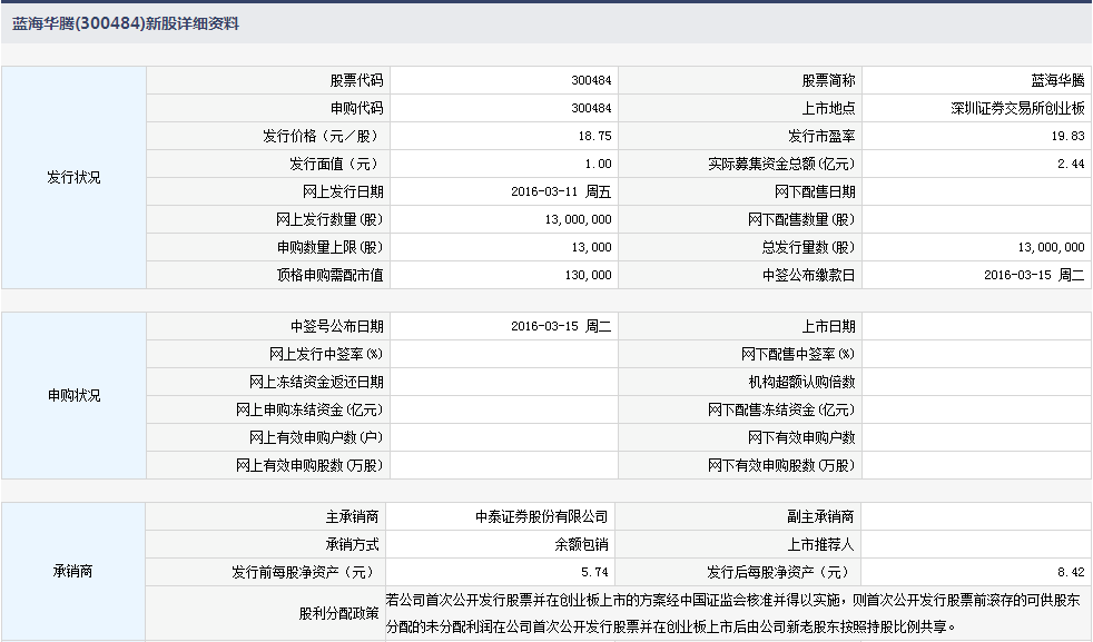 中国证券网讯 据交易所公告,蓝海华腾(300484)今日(3月11日)开启申购,本次发行新股不超过1300万股,占发行后总股本的比例不低于25%,发行后总股本不超过5200万股,公司发行价为18.75元,拟登陆深交所创业板上市。