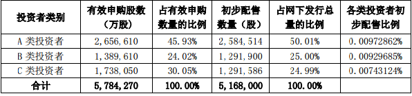 根据《初步询价及推介公告》和《发行公告》中公布的网下配售原则和计算方法,发行人和保荐机构(主承销商)对网下发行股份进行了初步配售,初步配售结果如下: