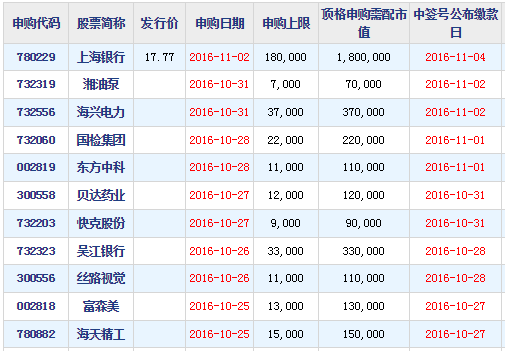 2016年10月24日新股日历