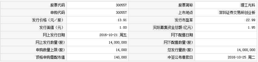 其中,武汉理工光科股份有限公司登陆深交所创业板上市交易。公司本次公开发行不超过1,400万股,发行价格为13.91元/股,发行市盈率为22.99倍。股票简称为“理工光科”,股票代码为“300557”。
