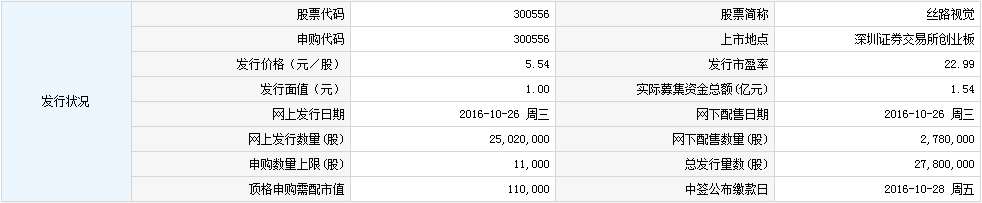 中国证券网讯 据深交所网站2日消息,深圳丝路数字视觉股份有限公司人民币普通股股票将于2016年11月4日在深交所创业板上市。证券简称为“丝路视觉”,证券代码为“300556”。公司人民币普通股股份总数为111,133,333股,其中首次公开发行的27,800,000股股票自上市之日起开始上市交易。