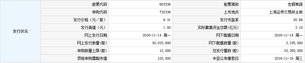 其中,宏辉果蔬股份有限公司股票登陆上海证券交易所主板。股票简称“宏辉果蔬”,股票代码“603336”,发行价格9.31元/股,本次公开发行的股票数量3335万股,公开发行后的总股本13335万股。