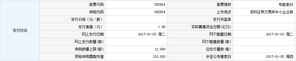 中国证券网讯 根据交易所公告,广东和胜工业铝材股份有限公司于2017年1月3日进行网上和网下申购。公司首次公开发行股票数量不超过3000万股,本次网下初始发行数量为1,800万股,为本次发行数量的60.00%;网上初始发行数量为1,200万股,为本次发行数量的40.00%。公司本次发行价格为9.80元/股,市盈率为22.98倍,股票申购简称为“和胜股份”,申购代码为“002824”。拟在深交所中小板上市。