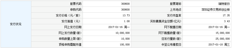 常熟瑞特电气股份有限公司于2017年1月25日起在深交所创业板上市。公司首次公开发行不超过2,500万股,本次发行价格为13.73元/股,市盈率为17.35倍,股票简称为“瑞特股份”,股票代码为“300600”。