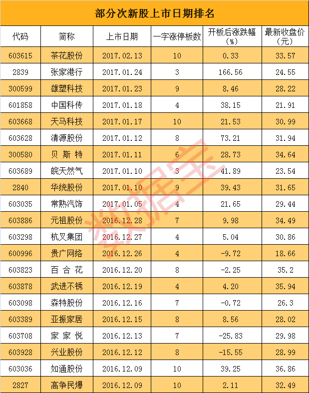 值得一提的是,部分尚未打开连续一字板且一字板已经较多的次新股最新价仍很低,比如已经连续12个一字板的白银有色,最新价仅8.03元;此外,海峡环保、重庆建工等个股最新价均不足20元,其一字涨停板数量均超过10个。(数据宝 陈见南)