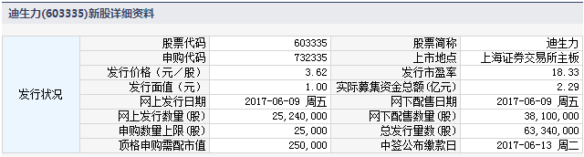 根据交易所公告,广东迪生力汽配股份有限公司于2017年6月9日进行网上和网下申购。本次公开发行股票数量为6,334万股,全部为公开发行新股,不设老股转让。本次公开发行后总股本为25,334万股,回拨机制启动前,网下初始发行数量为3,810万股,占本次发行总量的60.15%;网上初始发行数量为2,524万股,占本次发行总量的39.85%。