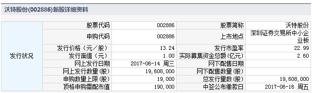 根据交易所公告,深圳市沃特新材料股份有限公司于2017年6月14日进行网上申购。本次公开发行股票总数量1,960.80万股,网上发行1,960.80万股,占本次发行总量的100%。本次发行股份全部为新股,不安排老股转让。
