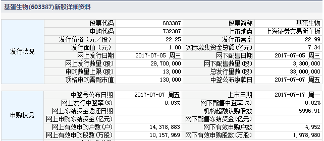 中国证券网讯 根据交易所公告,基蛋生物科技股份有限公司于2017年7月17日起在上海证券交易所主板上市交易。
