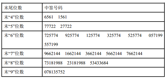 凡网上申购中宠股份首次公开发行股票的投资者持有的申购配号尾数与上述号码相同的,均为中签号码。中签号码共有 45,000 个,每个中签号码可以认购 500 股中宠股份 A 股股票。
