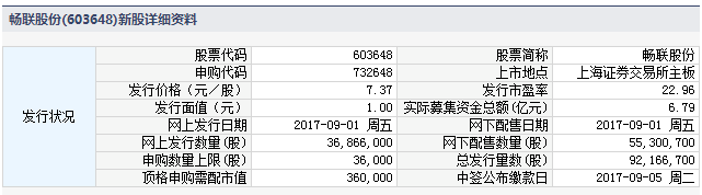 中国证券网讯 根据交易所公告,上海畅联国际物流股份有限公司于2017年9月1日进行网上和网下申购。本次发行股份数量为9,216.67万股,本次发行仅发行新股,不进行老股转让。回拨机制启动前,网下初始发行数量为5,530.07万股,占本次发行数量的60.00%;网上初始发行数量为3,686.60万股,占本次发行总量的40.00%。