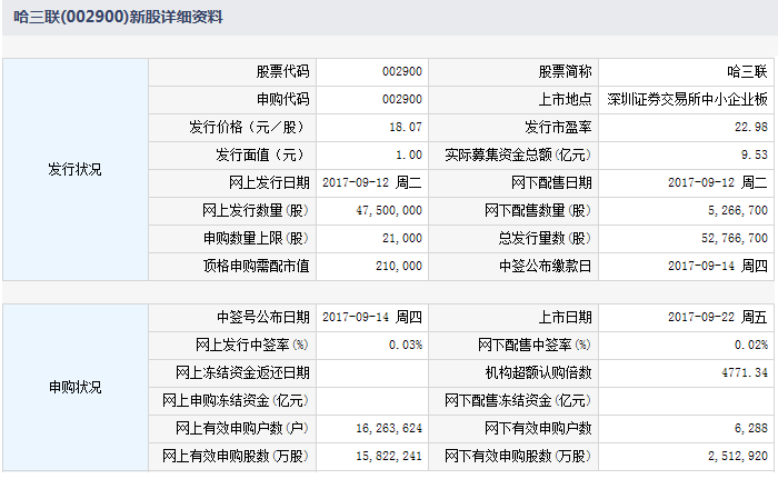 根据交易所公告,哈尔滨三联药业股份有限公司于2017年9月22日起在深圳证券交易所中小企业板上市交易。