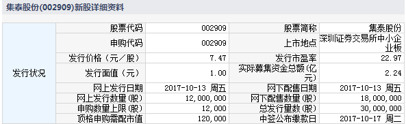 根据交易所公告,广州集泰化工股份有限公司于2017年10月13日进行网上和网下申购。发行人与主承销商协商确定本次发行股份数量为 3,000 万股,全部为新股。回拨机制启动前,网下初始发行 1,800 万股,占本次发行规模的 60%;网上初 始发行数量为 1,200 万股,占本次发行数量的 40%。