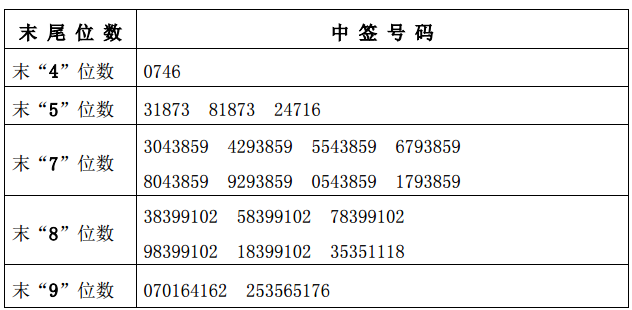 凡参与网上定价发行申购江苏华信新材料股份有限公司首次公开发行A 股股票的投资者持有的申购配号尾数与上述号码相同的,则为中签号码。中签号码共有 32,000 个,每个中签号码只能认购 500 股江苏华信新材料股份有限公司 A 股股票。