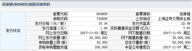 中国证券网讯 根据交易所公告,珀莱雅化妆品股份有限公司于2017年11月3日进行网上和网下申购。本次发行股份数量为 5,000 万股,回拨机制启动前,网下初始发行3,000万股,占本次发行规模的60%;网上初始发行数量为2,000 万股,占本次发行数量的 40%。
