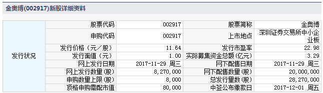 中国证券网讯 根据交易所公告,深圳市金奥博科技股份有限公司于2017年11月29日进行网上和网下申购。本次发行股份数量为2,827万股,全部为新股,回拨机制启动前,网下初始发行数量为2,000万股,为本次发行数量的70.75%;网上初始发行数量为827万股,为本次发行数量的29.25%。