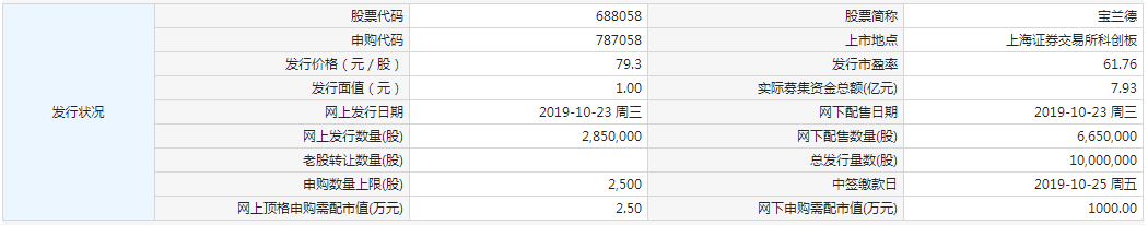 上证报中国证券网讯 据交易所公告,宝兰德今日申购,本次公开发行股份10,000,000股,申购代码:787058,申购价格:79.3元/股,单一账户申购上限2500股,顶格申购需配市值2.5万元。
