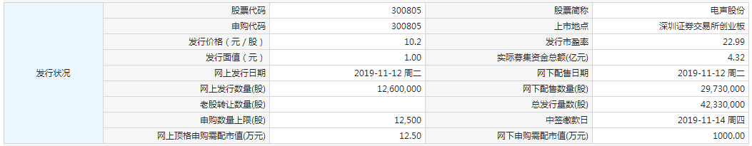 上证报中国证券网讯 据交易所公告,电声股份今日申购,本次公开发行股份42,330,000股,申购代码:300805,申购价格:10.2 元/股,单一账户申购上限12500股,顶格申购需配市值12.5万元。