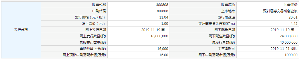 上证报中国证券网讯 据交易所公告,久量股份今日申购,本次公开发行股份40,000,000股,申购代码:300808,申购价格:11.04元/股,单一账户申购上限16000股,顶格申购需配市值16万元。