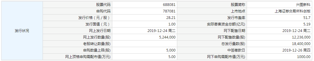 上证报中国证券网讯 据交易所公告,兴图新科今日申购,本次公开发行股份18,400,000股,申购代码:787081,发行价格:28.21元/股,单一账户申购上限5000股,顶格申购需配市值5万元。
