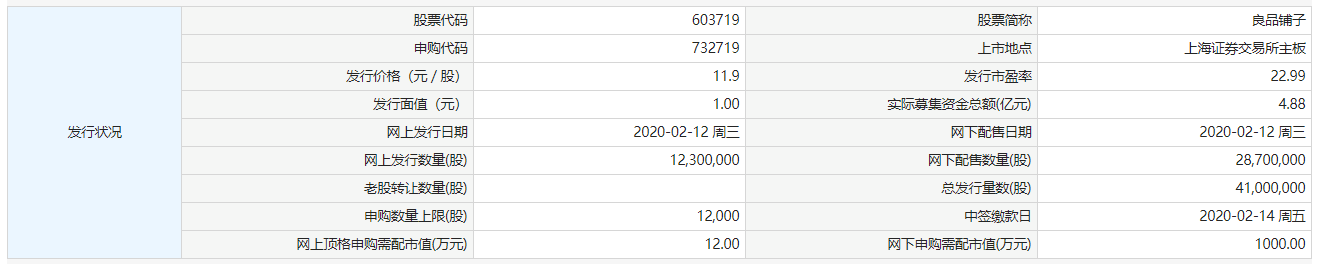 上证报中国证券网讯 据交易所公告,良品铺子今日申购,本次公开发行股份41,000,00股,申购代码:732719,发行价格:11.9元/股,单一账户申购上限12,000股,顶格申购需配市值12万元。