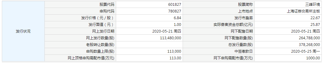 三峰环境今日申购 顶格申购需配市值113万元