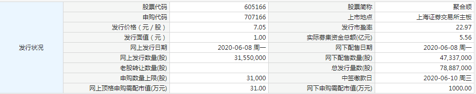 据交易所公告,聚合顺今日申购,本次公开发行股份78887000股,申购代码:707166,发行价格7.05元/股,单一账户申购上限31000股,顶格申购需配市值31万元。